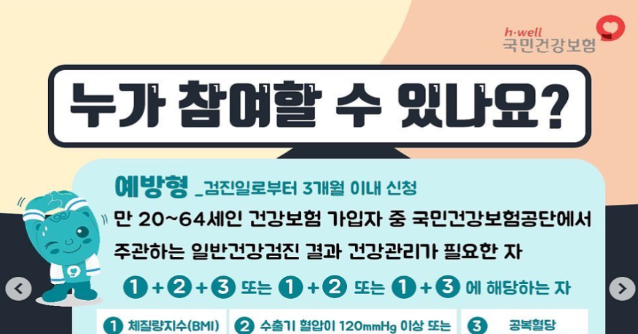 예방형은 국민건강보험공단에서 주관하는 국가건강검진을 받은 만 20~64세 중, BMI 25 이상이면서 혈압 또는 혈당에서 주의 이상 판정을 받는 등 건강관리가 필요한 분들이 대상입니다. 50대 남성분들은 최근 건강검진 결과에서 체중·혈압·혈당 쪽으로 경고를 받으셨다면 꽤 높은 확률로 예방형 대상자에 해당됩니다.