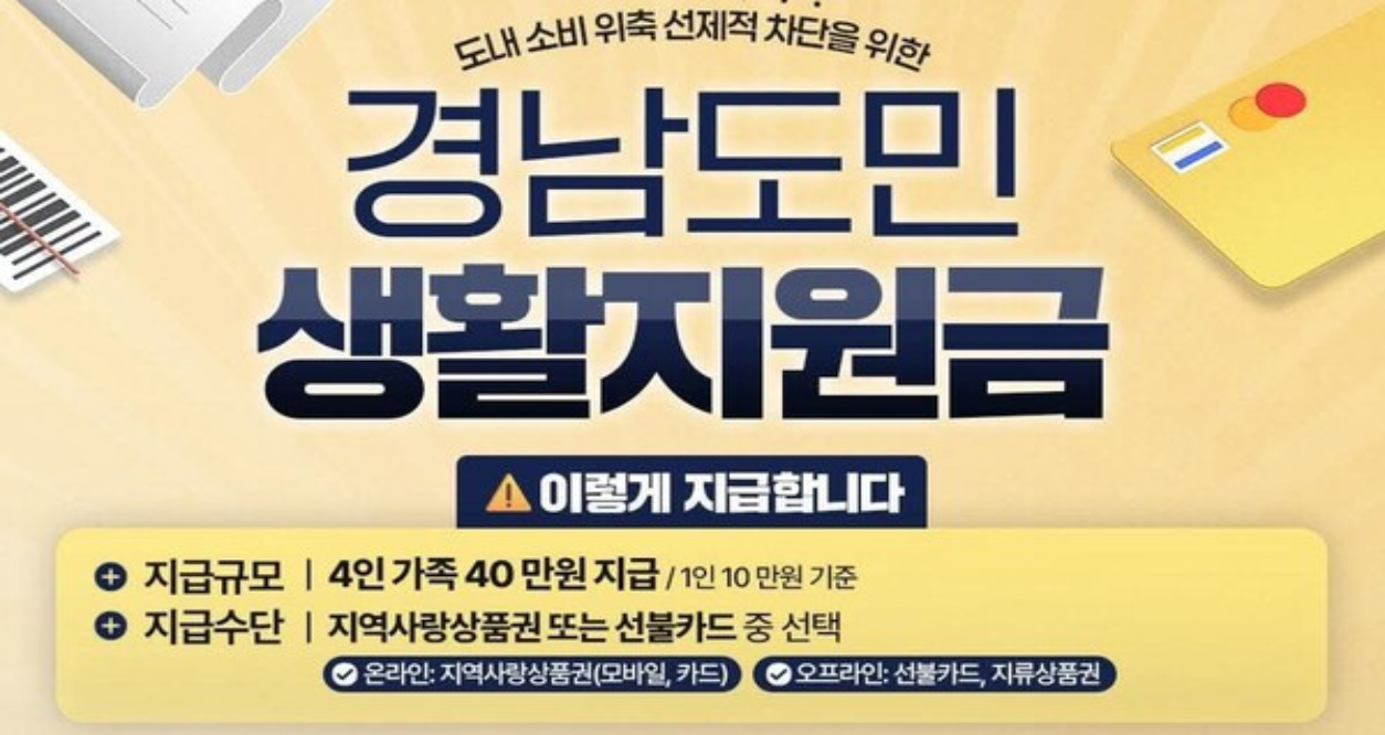 이제 경남 생활지원금 사용처가 핵심이에요. 지역 경제 살리기 위해 주소지 시·군 내에서만 쓸 수 있어요. 형태는 지역사랑상품권이나 은행 선불카드 중 선택 가능하죠. 전통시장, 골목상권에서 맛있는 음식 사 먹거나 생활必需품 사는 데 딱 좋겠네요.
