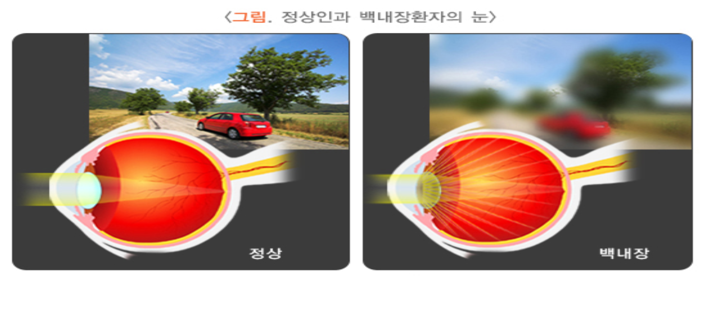 - 주요 증상: 시야 흐림, 빛 번짐, 색감 변화