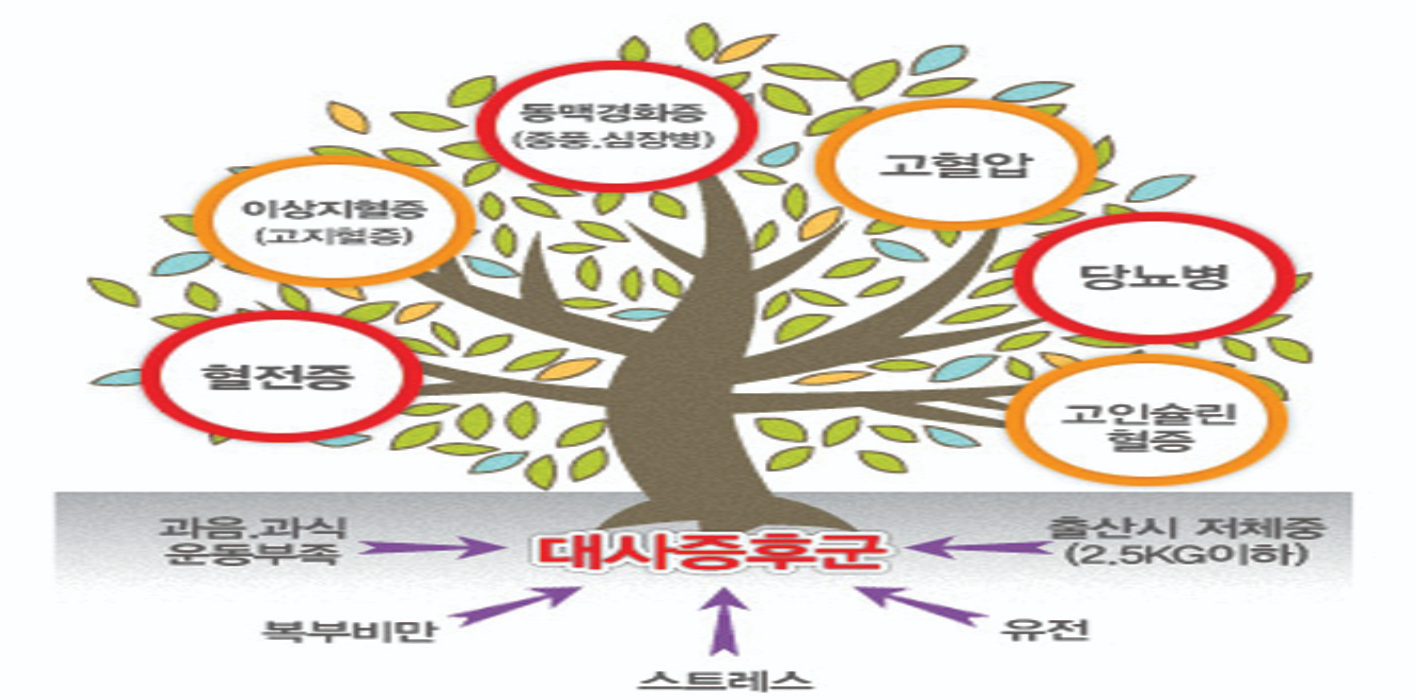 이런 요소들이 함께 나타나면 심혈관질환 발생률과 총 사망률을 25% 증가시키고, 향후 당뇨병 발생 위험도를 2~3배 증가시키는 등 심혈관질환의 발생위험을 매우 증가시키는 위험질환이 되는 거예요.