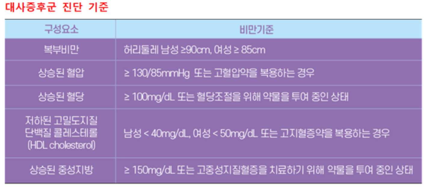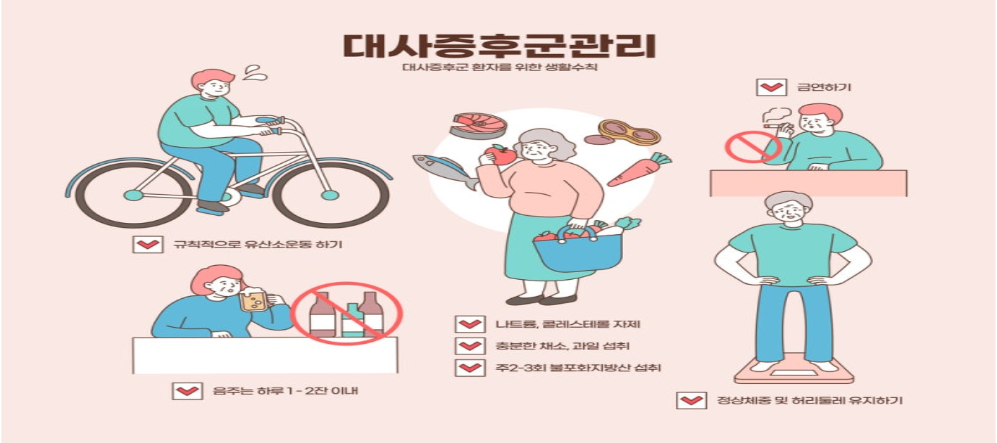 "대사증후군은 당뇨병, 고혈압, 만성콩팥병, 심뇌혈관질환 발생 위험도를 높이며, 유방암, 직장암 등 각종 암 발생 및 사망률과도 관계가 있습니다." - 질병관리청