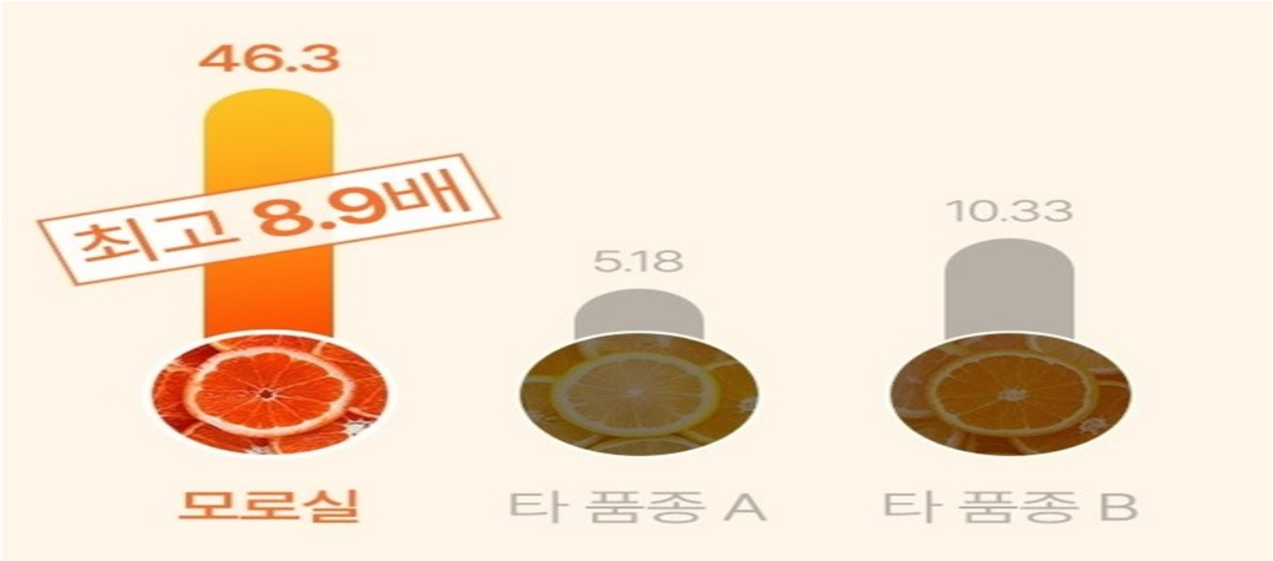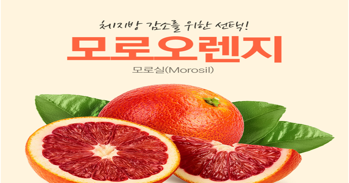 - 모로오렌지(모로실)는 항산화 성분과 안토시아닌이 풍부해 체지방 감소와 건강에 도움을 주는 성분으로 알려져 있습니다.