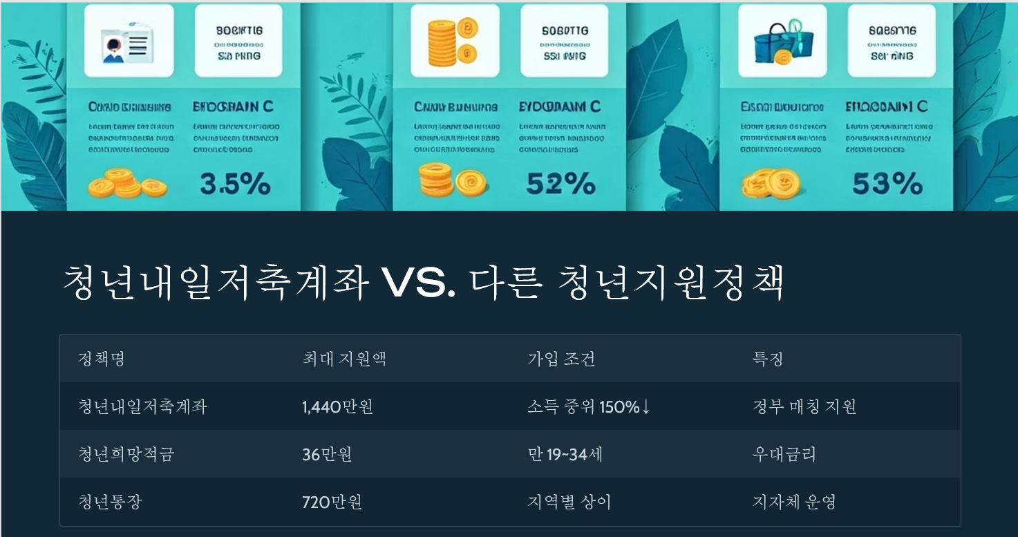 청년내일저축계좌가 모든 청년에게 최선의 선택은 아닙니다. 자신의 상황에 맞는 정책을 선택하기 위해 다른 청년 지원정책과 비교해 보겠습니다.