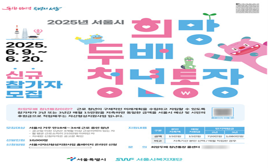 [요약] - '희망두배 청년통장'은 서울시가 저소득 청년 대상으로 저축액의 2배와 이자를 지원하는 자산형성 프로그램입니다. - 매월 15만 원씩 3년간 적금하면 시와 민간이 같은 금액을 적립해 만기 시 최대 1,080만 원+이자 수령 가능, 6월 20일까지 신청이 가능합니다. - 신청 자격, 혜택, 주의할 점 등 핵심 내용을 쉽게 정리했습니다.