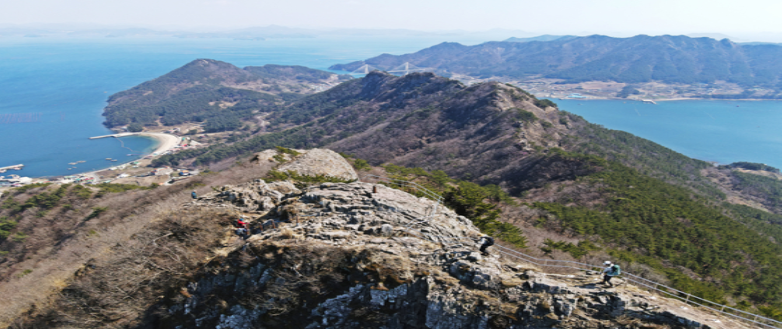 사량도에서 가장 잘 알려진 명소인 옥녀봉(해발 303m)에서 연결된 출렁다리는 39m와 22.2m 길이의 두 구간으로 구성되어 있습니다. 다리 위에서 느끼는 흔들림과 함께 펼쳐지는 바다 전망은 아찔하면서도 황홀한 경험을 선사합니다.